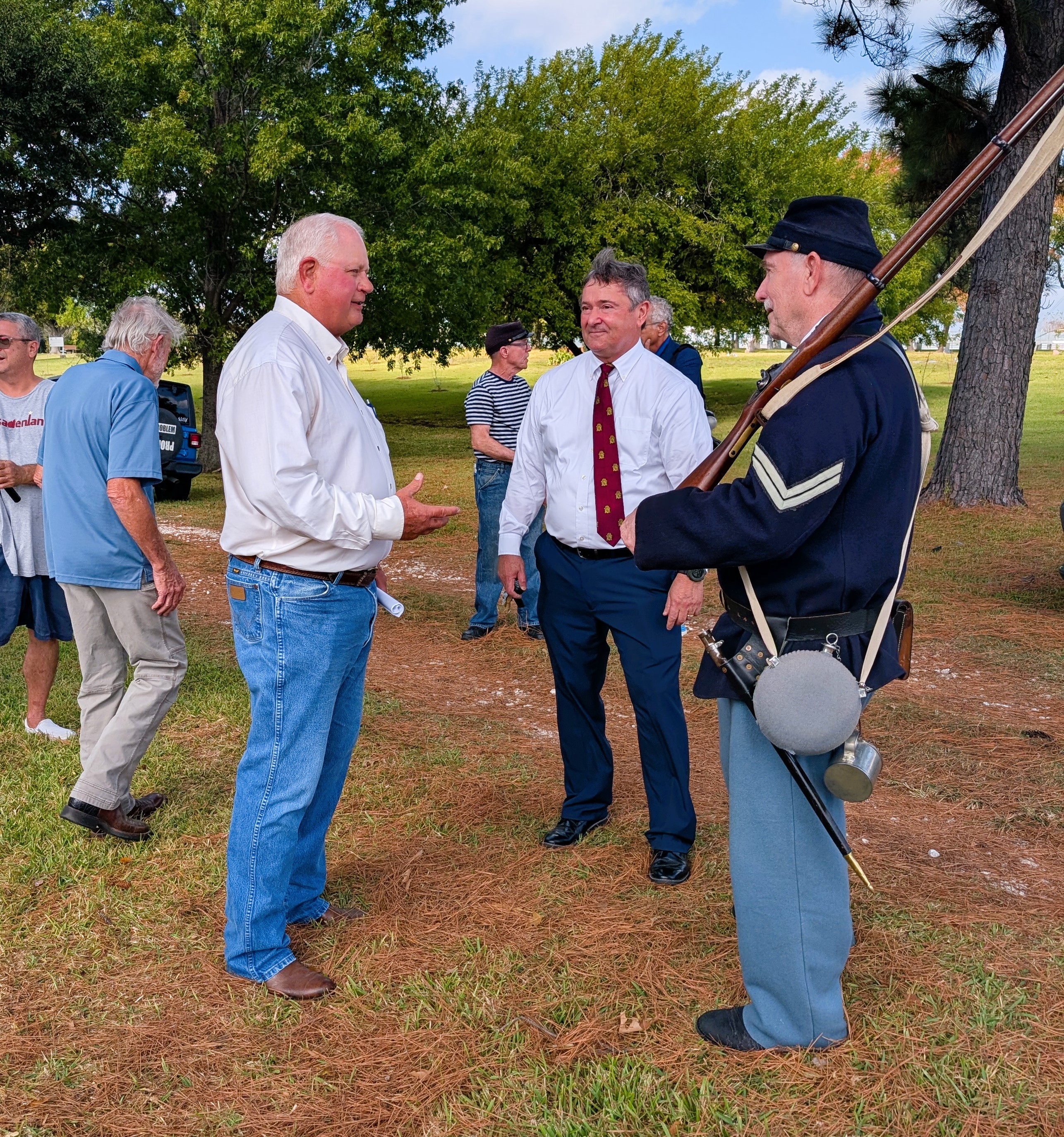 Veteran’s Day week kicked off on Saturday, November 8, 2025 at historic Crown Hill Cemetery in Pasadena, TX. Many veterans are buried at Crown Hill including 2 Union veterans of the Civil War. The cemetery recently acquired and installed permanent headstones for these 2 veterans, 2LT Milton H. Lakin of Co. H, 97th OH Infantry and PVT Horace C. Plumb of Co. A 95th IL Infantry, which previously had only temporary markers. We were honored to be invited to the event by association President Mike Murphey and to participate in the dedication of the headstones. Brother Michael Lance, PDC was the Grave Guard and fired a 3-round Honor Guard volley with Brother Daniel Pourreau, CC acting as Captain of the Guard. Brothers Richard Carson and Robert Riley also represented Camp 2.